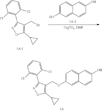 (a) Referring to the following reaction equation (Route A), Compound 1A-1 (1.0 g, 2.88 mmol, 1 eq.), Compound 1A-2 (0.46 g, 2.88 mmol, 1 eq.) and cesium carbonate (1.88 g, 5.76 mmol, 2 eq.) were dissolved in DMF (10 ml). The reaction was carried out at 65° C. for 2 h. After cooling, 10 ml water and 10 ml EA (ethyl acetate) were added for extraction, and the organic phase was washed with water and concentrated to dryness to give Compound 1A, 6-((5-cyclopropyl-3-(2,6-dichlorophenyl)isoxazol-4-yl)methoxy)naphthalen-2-ol, 0.8 g, yield: 65.0%. LCMS (ESI): calculated for C 23H 17C 12NO 3; [M+H] +: 426.1, found: 426.1.