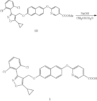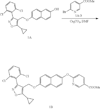 b) Referring to the following reaction equation, Compound 1A (0.2 g, 0.47 mmol, 1 eq.), 6-bromonicotinic acid methyl ester (0.1 g, 0.47 mmol, 1 eq.) and cesium carbonate (0.306 g, 0.94 mmol, 2 eq.) were dissolved in DMF (10 ml). The reaction was carried out at 65° C. for 2 h. After cooling, 10 ml water and 10 ml EA were added for extraction, and the organic phase was washed with water and concentrated to dryness to give Compound 1B, methyl 6((6((5-cyclopropyl-3-(2,6-dichlorophenyl)isoxazol-4-yl)methoxy)naphthalene-2-yl)oxy)nicotinate, 0.21 g, yield: 80.0%. LCMS (ESI): calculated for C 30H 22C 12N 2O 5; [M+H] +: 561.1, found: 561.1.