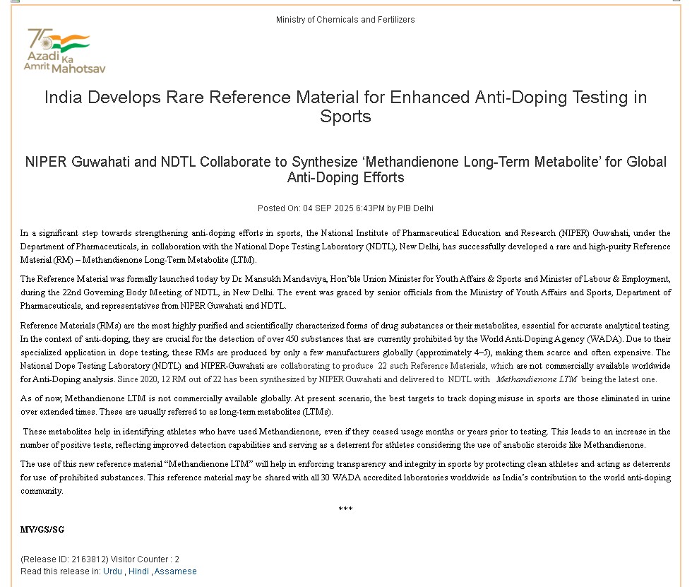 NIPER Guwahati and NDTL Collaborate to Synthesize ‘Methandienone Long-Term Metabolite’ for Global Anti-Doping Effortshttps://t.co/qm3wI69rFx