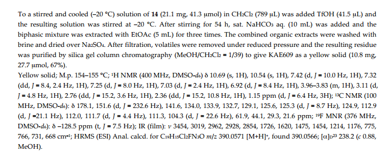 10 minutes and the reaction mixture is stirred for about 30 minutes at room temperature (20-35 degree C). After completion of the reaction chloroacetic anhydride (50mg) and triethylamine (0.2ml) are added at room temperature and the reaction mixture is stirred further for 1.5 hours at room temperature. After usual workup and purification of the crude products through preparative TLC 35mg of pure dihydroartemisinin 10- chloroacetate characterized by its spectral analysis is obtained.