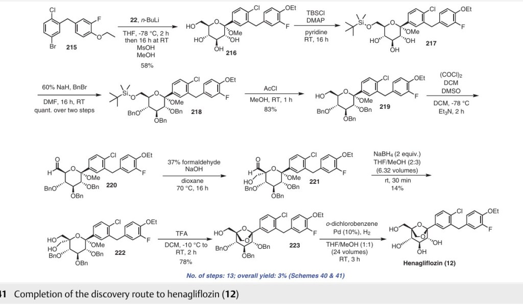 catalytic hydrogenation to afford the final product henaglifozin (12) (Scheme 41).