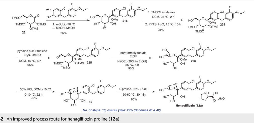 (12) in 95% yield, which was further treated with L-proline to give henagliflozin proline monohydrate 12a. The authors reported several advantages such as easy steps, cost-effective procedures, simple product purification and an overall method that was amenable for commercialization. This Addition of the aglycone intermediate 215 was carried out with 22 followed by mesylation of the OH group to provide 216 in 65% yield. Further, all the secondary hydroxy groups of intermediate 216 were selectively protected us ing TMSCl, imidazole and PPTS to give 224 in 95% yield. The free primary hydroxy group of 224 was oxidized using pyridine sulfur trioxide in triethylamine and DMSO to afford process involves 10 steps and gave an overall yield of 22% of henagliflozin proline (12a) (Schemes 40 and 42)