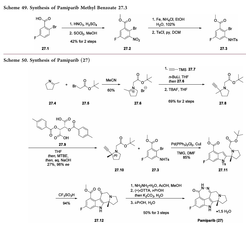 repair by functional homologous recombination (HR). 191,192 192 It was claimed that pamiparib showed good brain penetration ability for the treatment of cancer patients with brain metastasis. A small-scale synthesis of pamiparib (27) was first disclosed by BeiGene Limited in 2013.193 Later, they reported a