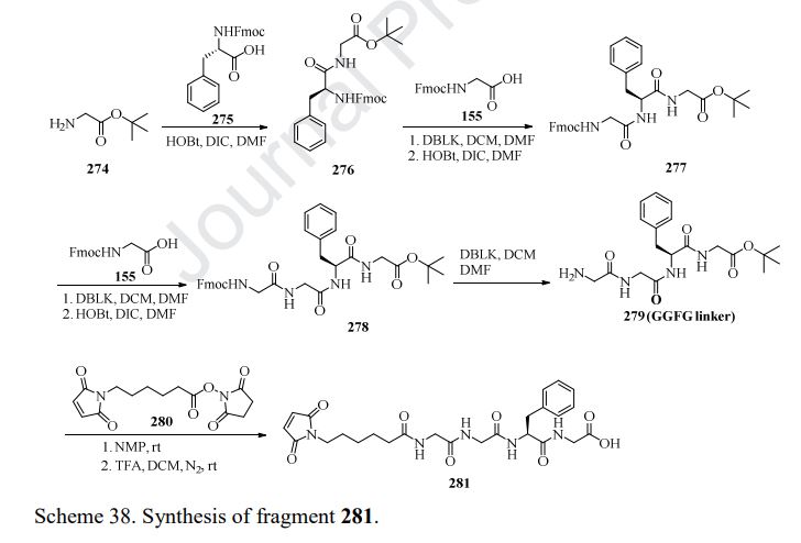 Fam-trastuzumab deruxtecan-nxki is an ADC that is comprised of an anti-HER2 antibody and the potent topoisomerase inhibitor exatecan [206]. These two entities are connected via a liner consisting of a maleimide conjugation handle that includes a protease-cleavable Gly-Gly-Phe-Gly (GGFG) tetrapeptide linker. This conjugation handle could release deruxtecan after internalization of the conjugate by the cancer cells that recognize the antibody. Fam-trastuzumabderuxtecan-nxki was developed by Daiichi Sankyo and AstraZeneca, and granted approval by the FDA in December 2019 [207]. There are approximately eight payload molecules/antibodies. Fam-trastuzumab deruxtecan-nxki has been approved for the treatment of adult patients with HER2 positive breast cancer that is unresectable or metastatic [208]. The synthesis of GGFG linker is described in Scheme 38 [209,210]. First, commercial tert-butyl 2-aminoacetate 274 was treated with Fmoc-L-Phe-OH 275 in the presence of HOBt and DIC, giving the corresponding product 276. Further deprotection of Fmoc group and amide formation gave the intermediate 278, which then underwent removal of Fmoc group to give GGFG linker 279. Lastly, treatment of 279 with the activated ester 280 provided 281.