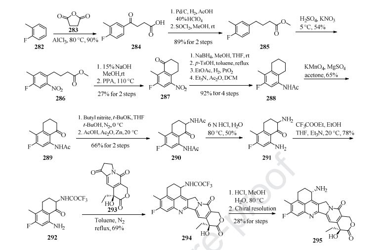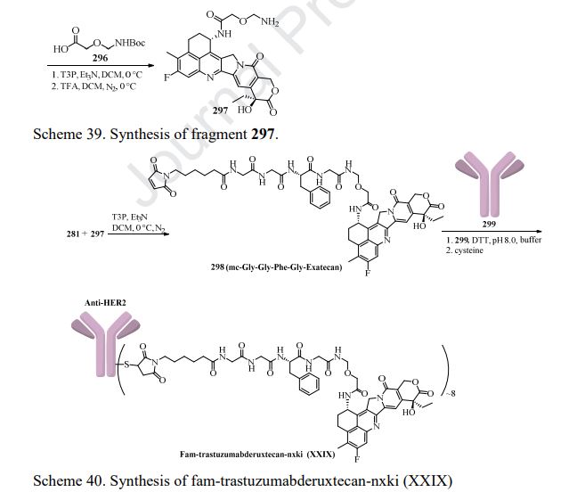 Preparation of the payload exatecan derivative is described in Scheme 39 [211]. Aluminum-catalyzed Friedel-Crafts acylation of o-fluorotoluene 282 with succinic andydride 283 gave intermediate 284 in 90% yield. Next, hydrogenation reduction ofthe carbonyl group of 284, followed by reaction with SOCl2 in MeOH, furnished 285, which then underwent nitration with H2SO4 and KNO3 to give compound 286 in 48% overall yield. Hydrolysis of 286 followed by treatment with polyphosphoric acid (PPA) gave the cyclization product 287 in only 27% yield. The transformation of 287 into 288 was realized following the four-step sequence: carbonyl reduction with NaBH4, acid-mediated elimination reaction, PtO2-catalyzed hydrogenation reduction, and acetylation with Ac2O. Regioselective benzylic oxidation of 288 in acetone with KMnO4 gave 289 in 65% yield, further functionalization with butyl nitrile and Zn-mediated acylation gave compound 290 in 66% yield over 2 steps. Treatment of 290 with aqueous HCl provided hydrolysis product 291 in 50% yield, which then coupled with ethyl trifluoroacetate to provide intermediate 292. Polycyclic compound 294 was prepared from 292 and 293 through a [4+2] cycloaddition reaction in refluxing toluene. The key intermediate 294 next underwent acidic hydrolysis and chiral resolution to provide the chiral product 295. Further condensation reaction with 296 in the presence of T3P and Et3N in DCM and TFA-promoted removal of the Boc group formed 297. The synthesis of fam-trastuzumab deruxtecan-nxki is described in Scheme 40 [212]. The linker 281 was coupled to 297 in the presence of T3P and Et3N to give the linker-payload 298. Through transformation of the disulfide bonds into free sulfhydryl groups for linkage (DTT in pH 8.0 buffer), followed by re-oxidation of the remaining disulfide bonds with cysteine, the linker-payload 298 was conjugated to the anti-HER2 mAb to give fam-trastuzumab deruxtecan-nxki (XXIX) based on the amount of protein with approximately eight linker/payloads per antibody.
