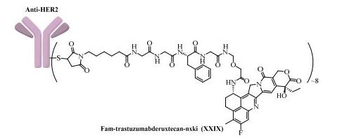 Trastuzumab deruxtecan (DS-8201a) is a HER2-targeting antibody-drug conjugate or ADC), structurally composed of a humanized anti-human HER2 (anti-hHER2) antibody, an enzymatically cleavable peptide-linker, and a proprietary topoisomerase I inhibitor payload (exatecan derivative or DX-8951 / DXd).