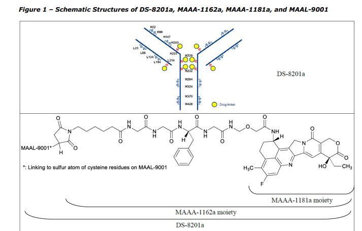 Trastuzumab deruxtecan active substance, also referred to as DS-8201a, results from the conjugation of the following intermediates: – Trastuzumab monoclonal antibody (MAAL-9001); – A drug-linker (MAAA-1162a) comprised of a Topoisomerase I inhibitor derivative of exatecan (MAAA1181a) and a tetrapeptide based cleavable linker (MFAH). MAAL-9001 is covalently conjugated to approximately 8 molecules of MAAA-1162a. The linker is designed to be stable in plasma to reduce systemic exposure to the released MAAA-1181a drug. After cell internalisation, the released MAAA-1181a drug leads to apoptosis of the target tumour cells via the inhibition of topoisomerase I. The released MAAA-1181a drug is cell-membrane permeable, giving the ability to penetrate and act in surrounding cells. The effect of the ADC derives primarily from the released MAAA-1181a drug and to a lesser extent to the antibody-dependent cellular cytotoxic (ADCC) effector function of the conjugated antibody. The quality of MAAL-9001 antibody, MAAA-1162a drug-linker and the conjugated antibody is described in separate sections. The structures of DS-8201a, MAAA-1162a, MAAA-1181a, and MAAL-9001 are provided in Figure 1.
