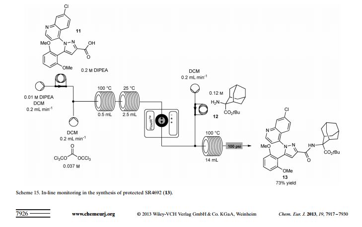 Triphosgene decomposition occurred in the presence of DIPEA at 100 °C into a stainless steel heat exchanger, where phosgene was generated. The crude mixture, containing also acid 35, then passed into a 2.5 mL stainless steel reactor coil at 25 °C, to complete the formation of the corresponding acyl chloride. An inline Flow-IR spectrometer(26)was used to monitor the formation of phosgene without exposing the operator to the toxic gas during analysis. As soon as acyl chloride was formed it was reacted with protected amino alcohol 37.