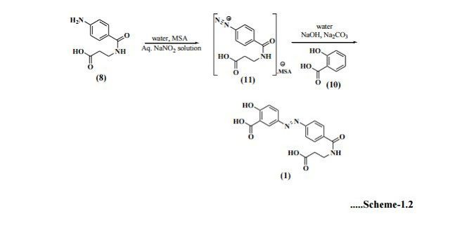 Optimization of this diazonium salt based process was performed by Huijun et al[19] and reported the preparation of the title compound in 64.6% overall yield. Zhenhau et al[20] have synthesized 1 from 4-nitrobenzoic acid (12) via chlorination, condensation, hydrogenation, diazotization, coupling and salt formation with overall yield 73%. Li et al[21] have given product in 73.9% total yield starting from 4-nitrobenzoyl chloride (6), where as Yuzhu et al[22] confirmed chemical structure of Balsalazide disodium by elemental analysis, UV, IR, 1H-NMR and ESI-MS etc. Shaojie et al[23] have also followed same process for its preparation. Yujie et al[24] synthesized 1 in this way; preparation of 4-nitrobenzoyl-β-alanine (7) under microwave irradiation of 420 W at 52oC for 10sec., reduction in ethyl acetate in the presence of Pd/C catalyst then diazotization, coupling and salt formation. Eckardt et al[25] have developed a process for the preparation of Balsalazide which comprises, conversion of 4-aminobenzoyl-β-alanine (8) to 4-ammoniumbenzoyl-β-alanine sulfonate salt using a sulfonic acid in water. This was treated with aq. sodium nitrite solution at low temperature to generate 4-diazoniumbenzoyl-β-alanine sulfonate salt (11) which was quenched with aq. disodium salicylate to furnish Balsalazide disodium solution. This was further acidified to allow isolation of 1 and then conversion to disodium salt (Scheme-1.2) in 76% yield.