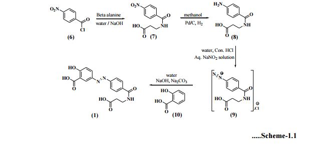 Balsalazide disodium and its complete synthesis was first disclosed by Chan[18] in 1983, assigned to Biorex Laboratories Limited, England, claiming product ‘Balsalazide’ and process of its preparation. The synthesis involves converting 4-nitrobenzoyl chloride (6) to 4- nitrobenzoyl-β-alanine (7), hydrogenating with Pd/C (5%) in ethanol and isolating by adding diethyl ether to produce 4-aminobenzoyl-β-alanine (8). Thereafter, 4-aminobenzoyl-β-alanine (8) was treated with hydrochloric acid and sodium nitrite to generate N-(4-diazoniumbenzoyl)- β-alanine hydrochloride salt (9) which was reacted at low temperature with disodium salicylate to furnish Balsalazide disodium insitu which was added to dilute hydrochloric acid at low temperature to produce Balsalazide (1) (Scheme-1.1). Thus obtained Balsalazide was recrystallized with hot ethanol and converted to pharmaceutically acceptable salt (disodium salt).
