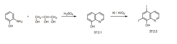 Iodoquinol, 5,7-diiodo-8-quinolinol (37.2.2), is made by iodination of 8-oxyquinoline (37.2.1) using a mixture of potassium iodide/potassium iodate. The initial 8-hydroxyquinolin (37.2.1) is made from 2-aminophenol and glycerol in the presence of sulfuric acid and nitrobenzene (Skraup synthesis).