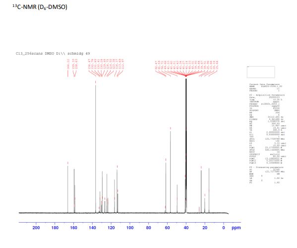 13C NMR (125 MHz, D6-DMSO) δ: 166.2, 159.3, 158.6, 136.5, 132.7, 131.9, 130.4, 130.3, 129.4, 126.8, 124.5, 123.4, 116.4, 113.7, 113.0, 61.6, 56.8, 49.7, 41.1, 23.9, 20.2, 15.7.