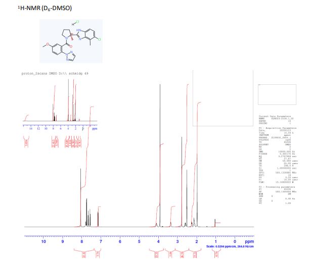 (S)-/V-(2-amino-4-chloro-3-methylphenyl)-1-(5-methoxy-2-(2H-1 ,2,3-triazol-2-yl) benzoyl)-2 methylpyrrolidine-2-carboxamide (145 g, 0.31 mol) was dissolved in isopropanol (870 mL) at 20 °C. To this solution was added carefully 5-6 N HCI in isopropanol (260 mL) over 10 min. the reaction mixture was then heated up to 90 °C and stirred for 4 hours. Water (28 mL) was added and the reaction mixture was stirred for an additional one hour. The reaction mixture was cooled to 20 °C. A light brown suspension was obtained which was filtered. The cake was rinsed with isopropanol (220 mL). The solid was finally dried under reduced pressure at 60 °C to give a beige solid. Yield: 133 g, 88%, 100% a/a (LC-MS), M+1 =451. Melting point: 277 °C (DSC). Ή NMR (400 MHz, DMSO) δ: 8.06 (s, 2 H), 7.76 (d, J = 8.9 Hz, 1 H), 7.63 (d, J = 8.8 Hz, 2 H), 7.55 (m, 1 H), 7.16 (dd, J1 = 2.7 Hz, J2 = 8.9 Hz, 1 H), 3.98 (m, 1 H), 3.90 (s, 3 H), 3.33 (m, 2H), 3.32 (m, 1 H), 2.74 (s, 3 H), 2.55 (m, 1 H), 2.23 (m, 1 H), 2.10 (m, 2 H), 1.95 (s, 3 H).