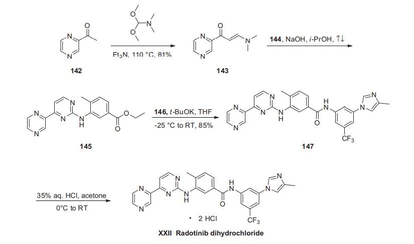 Because of the structural similarity of radotinib to that of nilotinib (Tasigna ®), the process-scale synthetic route (which is depicted in the scheme) is capable of furnishing both drugs.Claisen condensation of commerical 2-acetylpyrazine (142) with N,N-dimethylformamide dimethylacetal gave rise to the enamino ketone 143 in 81% yield. Under basic conditions, vinylogous amide 143 was coupled with commercial guanidine nitrate 144187 to produce aminopyridine 145. Subsequent condensation with commercial aniline (146) by means of potassium t-butoxide in THF constructed radotinib 147 in 85% yield as the free base, and this material could be converted to the radotinib dihydrochloride (XXII) upon exposure to concentrated hydrochloric acid in chilled acetone.