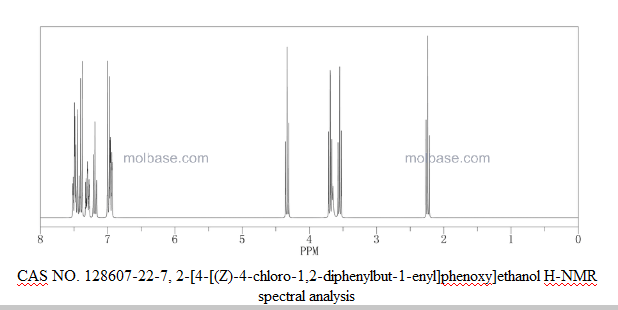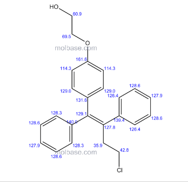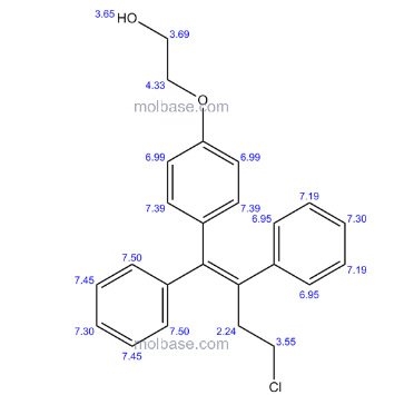 Z-isomer, 1H NMR (CDCl3): 2.92 (t, 2H, =CH2CH2Cl), 3.42 (t, 2H, =CH2CH2 Cl), 3.85-3.89 (m, 4H, OCH2CH2), 6.56 (d, 2H, aromatic proton ortho to hydroxy), 6.80 (d, 2H, aromatic proton meta to hydroxy), 7.1-7.43 (m, 10H, aromatic protons).