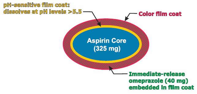 Pozen’s PA-325/40 is a combination pill containing enteric-coated aspirin 325 mg surrounded by a pH-sensitive film surrounded by an immediate-release omeprazole 40 mg.