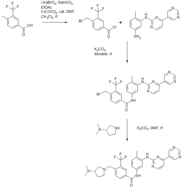 1-X (841 g) in CH2Cl2 (8.4 L) at 25°C. The mixture was stirred at 25°C for 15 hours. After the reaction was completed as evidenced by TLC, the solution was concentrated and EtOAc (5 L) was added to the resultant residue. The solution was concentrated to 3L (1/2 of the original volume) under low pressure at 500C. Then, n-hexane (3 L) was added to the concentrated solution. The solid product formed at 500C by seeding to afford the desired crude product 1-XI (600 g, 60% yield) after filtration and evaporation. To compound 1-XI (120.0 g) and piperazine (1-XII, 50.0 g, 3 eq) in 1- pentanol (360 niL) was added Et3N (60.0 g, 3.0 eq) at 25°C. The mixture was stirred at 1200C for 8 hours. Ethyl acetate (480 mL) was added to the reaction mixture at 25°C. The solution was stirred for Ih. The Et3NHCl salt was filtered and the solution was concentrated and purified by silica gel (EtOAc/MeOH = 2:8) to afforded 1-XIII (96 g) in a 74% yield.