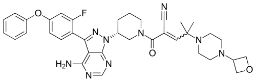 https://patents.google.com/patent/WO2015127310A1/enExample 1Synthesis of 2-[(3R)-3-[4-amino-3-(2-fluoro-4-phenoxy-phenyl)pyrazolo[3,4-d]pyrimidin-l- yl]-piperidine-l-carbonyl]-4-m iperazin-l-yl]pent-2-enenitrile