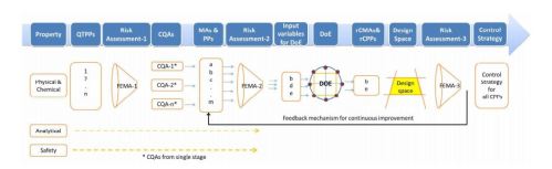 The importance of Quality by Design (QbD) is being realized gradually, as it is gaining popularity among the generic companies. However, the major hurdle faced by these industries is the lack of common guidelines or format for performing a risk-based assessment of the manufacturing process. This article tries to highlight a possible sequential pathway for performing QbD with the help of a case study. The main focus of this article is on the usage of failure mode and effect analysis (FMEA) as a tool for risk assessment, which helps in the identification of critical process parameters (CPPs) and critical material attributes (CMAs) and later on becomes the unbiased input for the design of experiments (DoE). In this case study, the DoE was helpful in establishing a risk-based relationship between critical quality attributes (CQAs) and CMAs/CPPs. Finally, a control strategy was established for all of the CPPs and CMAs…