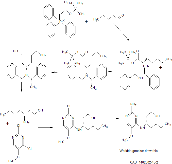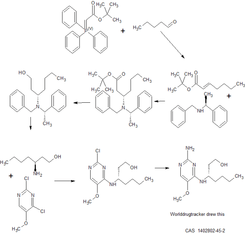 Into a 50 ml_ vial equipped with a magnetic stir bar was placed 2,4-dichloro-5- methoxypyrimidine (2.0 g, 1 1.7 mmol), and acetonitrile (20 ml_), diisopropylethylamine (3.02 g, 23.4 mmol) and (S)-3-aminoheptanol (4.59 g, 35.1 mmol). The reaction mixture was allowed to stir 15 hours at room temperature. The solvents were removed under reduced pressure. The crude was purified via silica gel column chromatography using a dichloromethane to 10% methanol in dichloromethane gradient. The best fractions were pooled and the solvents were removed under reduced pressure to afford a white solid, B.