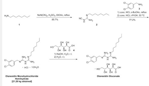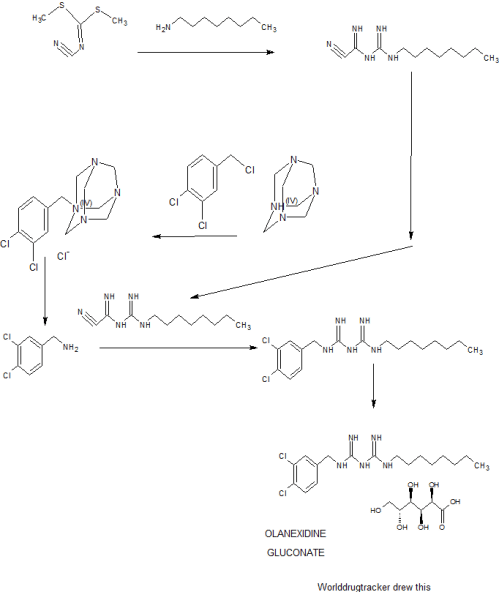 Olanexidine gluconate is an antiseptic/disinfectant compound with potent bactericidal activity against Gram-negative and Gram-positive bacteria, for use in preparing patients for surgery and preventing of postoperative bacterial infections.