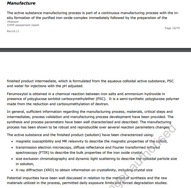 The drug consists of intravenously administered bioavailable iron which allows for more efficient replenishment of the body’s iron stores than oral iron supplements, without their associated common side effects. Ferumoxytol is a blood pool agent, a true intravascular contrast agent that remains in the blood stream for an extended period of time. Based on this quality, the product may be useful as a contrast agent in a wide range of applications in MRI.