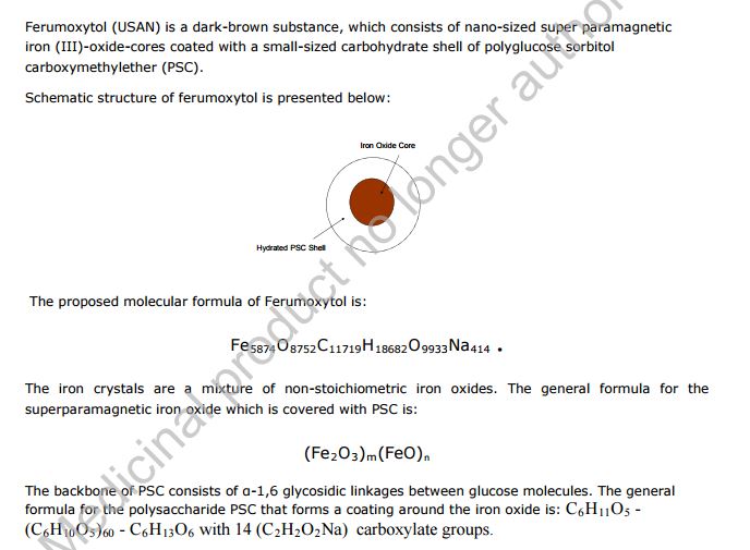 Polyglucose sorbitol carboxymethyl ether-coated non-stoichiometric magnetite. Ferumoxytol is a superparamagnetic iron oxide that is coated with a low molecular weight semi-synthetic carbohydrate, polyglucose sorbitol carboxymethyl ether. The iron oxide is a superparamagnetic form of non-stoichiometric magnetite with crystal size of 6.2 to 7.3 nm. In solution, the colloidal particle of ferumoxytol has a Stokes diameter of 18-20 nm. Molecular weight is approximately 308,000