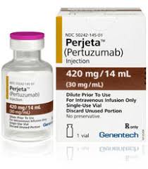 Pertuzumab (also called 2C4, trade name Perjeta) is a monoclonal antibody. The first of its class in a line of agents called “HER dimerization inhibitors”. By binding to HER2, it inhibits the dimerization of HER2 with other HER receptors, which is hypothesized to result in slowed tumor growth.[1] Pertuzumab received US FDA approval for the treatment of HER2-positive metastatic breast cancer on June 8, 2012.[2] Pertuzumab was developed at Genentech and is now owned by Roche which acquired Genentech in 2009.