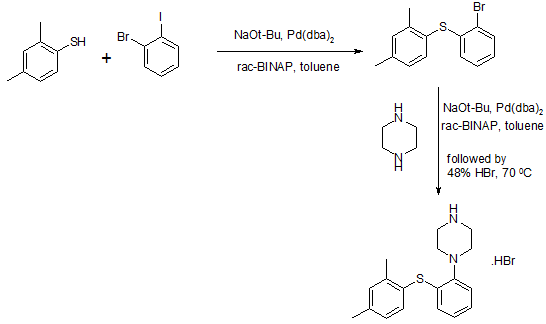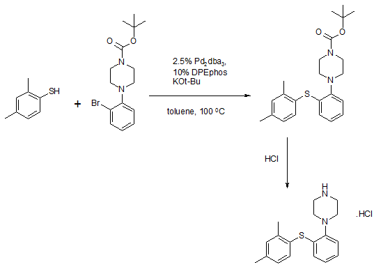 The preparation of vortioxetine is also described by Bang-Andersen et al. in J. Med. Chem. (201 1 ), Vol. 54, 3206-3221 . Here, in a first step, te/t-butyl 4-(2-bromophenyl)piperazine-1 -carboxylate intermediate is prepared from Boc-piperazine and 2-bromoiodobenzene in a palladium catalyzed coupling reaction. te/t-Butyl 4-(2-bromophenyl)piperazine-1 -carboxylate is then reacted with 2,4-dimethylthiophenol, again in the presence of palladium catalyst and a phosphine ligand, to provide Boc-protected vortioxetine. In the final step, vortioxetine is deprotected using hydrochloric acid to give vortioxetine hydrochloride.
