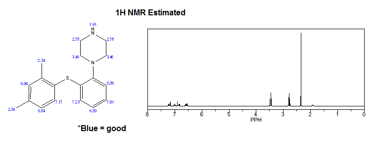 Mixture of (2,4-dimethylphenyl)(2-iodophenyl)sulfane V (0.34 g, 1 .0 mmol), piperazine VI (0.13 g, 1 .5 mmol), K3P03 (0.42 g, 2.0 mmol), Cul (19 mg, 0.1 mmol), and 2-phenylphenol (68 mg, 0.4 mmol) in dry and degassed DMSO (2 mL) was heated under nitrogen atmosphere at 120°C for 20 h. Water (10 mL) is then added and product is extracted to EtOAc (3 x 10 mL). Combined organic layers were washed with water (3 x 10 mL) and brine (2 x 10 mL) and dried over Na2S04. After evaporation of the solvent crude product is purified by chromatography to afford title compound: H NMR (CDCI3, 500 MHz) δ 1 .63 (br s, 1 H), 2.33 (s, 3H), 2.37 (s, 3H), 3.02-
