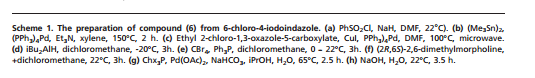 To a solution of 6-chloro-4-(5-{[(2R,6S)-2,6-dimethyl-4-morpholinyl]methyl}-1 ,3-oxazol-2- yl)-1-(phenylsulfonyl)-1 H-indazole (0.20 g, 0.411 mmol) and N-[2-(methoxy)-5-(4,4,5,5- tetramethyl-1 ,3,2-dioxaborolan-2-yl)-3-pyridyl]methanesulfonamide (0.175 g, 0.534 mmol) in 1 ,4-dioxane (2 ml) was added chloro[2′-(dimethylamino)-2-biphenylyl]palladium- 1 (1 /?,4S)-bicyclo[2.2.1]hept-2-yl[(1 S,4/?)-bicyclo[2.2.1]hept-2-yl]phosphane (11.5 mg, 0.021 mmol), potassium phosphate tribasic (0.262 g, 1.23 mmol) and water (0.2 ml). The reaction mixture was heated and stirred at 12O0C under microwave irradiation for 1 h. Additional chloroP’^dimethylamino^-biphenylyOpalladium-^I R^S^bicycloP^.ilhept^- yl[(1 S,4/?)-bicyclo[2.2.1]hept-2-yl]phosphane (11.5 mg, 0.021 mmol) and potassium phosphate tribasic (80 mg) were added and the reaction heated to 12O0C under microwave irradiation for 1 h. Additional potassium phospate tribasic (80 mg) was added and the reaction heated under the same conditions for a further 1 h. The reaction mixture was filtered through a silica SPE and eluted with methanol. The solvent was removed in vacuo and the residue partitioned between dichloromethane (5 ml) and water (5 ml). The layers were separated and the aqueous extracted with further dichloromethane (2x 2 ml). The combined organics were concentrated under a stream of nitrogen and the residue dissolved in MeOH:DMSO (3ml, 1 :1 , v/v) and purified by MDAP (method A) in 3 injections. The appropriate fractions were combined and concentrated to give a white solid which was dissolved in MeOH:DMSO (1 ml, 1 :1 , v/v) and further purified by MDAP (method B). The appropriate fractions were basified to pH 6 with saturated sodium bicarbonate solution and extracted with ethyl acetate (2x 25 ml). The combined organics were dried and evaporated in vacuo to give a white solid which was further dried under nitrogen at 4O0C for 3 h to give the title compound as a white solid (26 mg). LCMS (Method A): Rt 0.53 mins, MH+ 513.