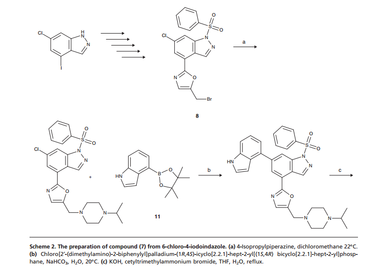 6-Chloro-4-(5-{[4-(1-methylethyl)-1-piperazinyl]methyl}-1 ,3-oxazol-2-yl)-1-(phenylsulfonyl)- 1H-indazole (97 mg, 0.194 mmol), 4-(4,4,5,5-tetramethyl-1 ,3,2-dioxaborolan-2-yl)-1 H- indole (61.3 mg, 0.252 mmol, available from Frontier Scientific Europe), chloro[2′- (dimethylamino)-2-biphenylyl]palladium-(1 R,4S)-bicyclo[2.2.1]hept-2-yl[(1 S,4R)- bicyclo[2.2.1]hept-2-yl]phosphane (10.87 mg, 0.019 mmol) and potassium phosphate tribasic (124 mg, 0.582 mmol) were dissolved in 1 ,4-dioxane (1 ml) and water (0.1 ml) and heated in a Biotage Initiator microwave at 1000C for 30 min. Additional 4-(4, 4,5,5- tetramethyl-1 ,3,2-dioxabotolan-2-yl)-1 H-indole (61.3 mg, 0.252 mmol) and chloro[2′- (dimethylamino)-2-biphenylyl]palladium-(1 R,4S)-bicyclo[2.2.1]hept-2-yl[(1 S,4R)- bicyclo[2.2.1]hept-2-yl]phosphane (5 mg) were added and the reaction heated at 1 1O0C for 30 min, then 14O0C for 30 min. The solvent was removed in vacuo and the residue purified by silica gel chromatography, eluting with 0-25% methanol in dichloromethane. The appropriate fractions were combined and concentrated to give a brown solid which was dissolved in MeOH:DMSO (1 ml, 1 :1 , v/v) and purified by MDAP (method A). The appropriate fractions were concentrated in vacuo to give the title compound as a white solid (30 mg).