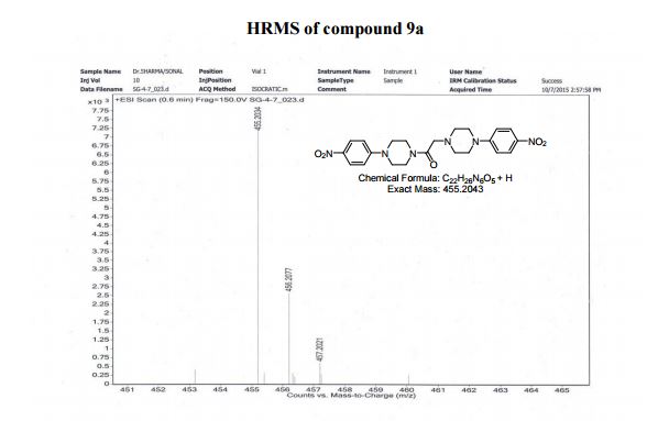 1, 2-Bis(4-(4-4-nitrophenyl)piperazin-1-yl)ethanone (9a) To the mixture of 8a (0.3 g, 1.06 mmol) and Et3N (0.3 mL, 2.12 mmol) in CHCl3 (5 mL) was added 1-(4-nitrophenyl)piperazine (7a, 0.320 g, 1.59 mmol) in 5 mL CHCl3 dropwise within 1 h. After complete addition reaction mixture was further stirred in an oil bath at 80-85 °C for 15 h. The reaction mixture was cooled, washed with water (5 mL × 3) and the organic layer was separated. Combined organic layer was dried (anhyd. Na2SO4 and concentrated under reduced pressure in rotavapor. The solid obtained was purified by recrystallization using EtOAc/Hexane which furnished yellow crystals (yield 81%);