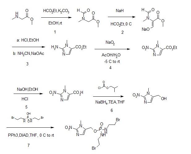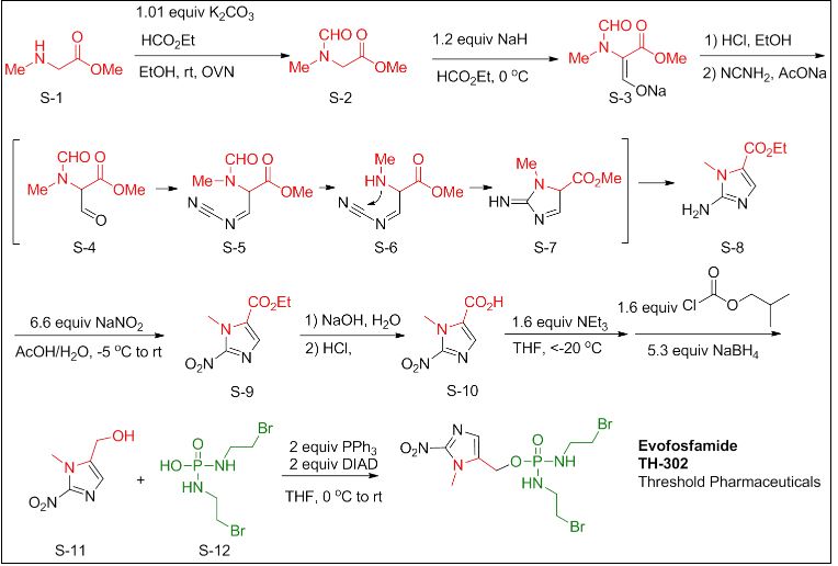 From compound S-1 starting aminoacyl protection is S-2 , a suspension of NaH grab α -proton, offensive, ethyl, acidification, introduction of an aldehyde group, S-3followed by condensation with the amino nitrile, off N- acyl ring closure, migration rearrangement amino imidazole compound S-. 8 , the amino and sodium nitrite into a diazonium salt, raising the temperature, nitrite anion nucleophilic attack diazonium salt obtained nitro compound S-9, under alkaline conditions ester hydrolysis gives acid S-10 , followed by NEt3 under the action of isobutyl chloroformate and the reaction mixed anhydride formed by of NaBH 4 reduction to give the alcohol S-. 11 , [use of NaBH 4 reduction of the carboxyl group is another way and the I 2 / of NaBH 4 ] , to give S-11 later, the DIAD / PPh3 3 under the action via Mitsunobu linking two fragments obtained reaction Evofosfamide