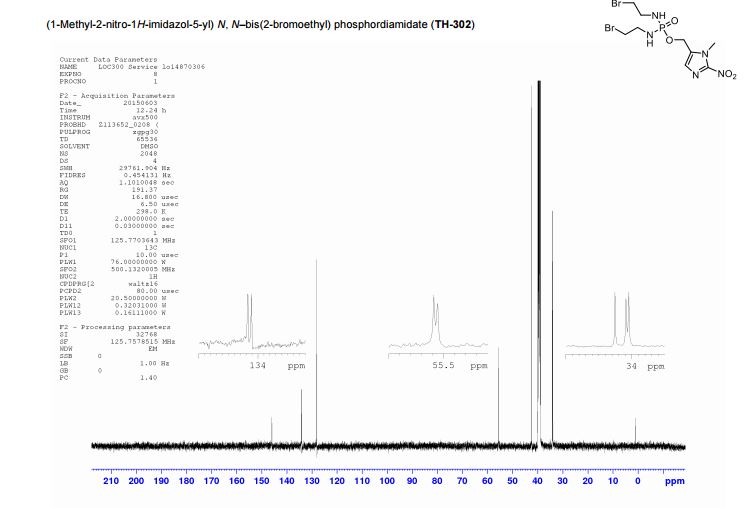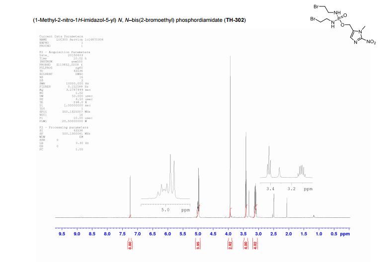 The residue was then purified by semi-preparative HPLC on a Phenomenex Luna (C18(2), 10 µm, 250 × 10 mm) column, eluting with H2O and methanol (50 – 70% methanol over 10 min, then 1 min wash with methanol, 5 mL/min flow rate) to afford TH-302 as a yellow gum: vmax (solid) cm-1 : 3212 (br), 1489 (m), 1350 (m), 1105 (m), 1004 (s); δH (DMSO-D6, 400 MHz) 7.25 (1H, s, CH), 5.10–4.90 (2H, m, NHCH2CH2Br), 4.98 (2H, d, J 7.8, CH2O), 3.94 (3H, s, CH3), 3.42 (4H, t, J 7.0, NHCH2CH2Br), 3.11 (4H, dt, J 9.8, 7.2, NHCH2CH2Br); δC (DMSO-D6, 126 MHz) 146.1, 134.2 (d, J 7.5, OCH2CN), 128.2, 55.6 (d, J 4.6, CH2O), 42.7, 34.2 (d, J 26.4, CH2Br), 34.1; δP (DMSO-D6, 202 MHz) 15.4; HRMS m/z (ESI− ) [found; (M-H)− 447.9216, C9H16 79Br81BrN5O4P requires (M-H)− 447.9213]; m/z (ESI+ ) 448.0 ([M-H]− , 60%, [C9H15 79Br81BrN5O4P] − ), 493.9 ([M+formate] − , 100%, [C10H17 79Br81BrN5O6P] − ). These data are in good agreement with the literature values.4