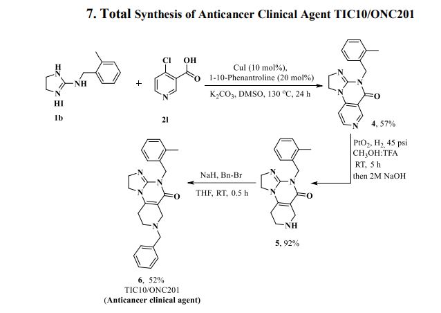 Herein, we present a copper-catalyzed tandem reaction of 2-aminoimidazolines and ortho-halo(hetero)aryl carboxylic acids that causes the regioselective formation of angularly fused tricyclic 1,2-dihydroimidazo[1,2-a]quinazolin-5(4H)-one derivatives. The reaction involved in the construction of the core six-membered pyrimidone moiety proceeded via regioselective N-arylation–condensation. The presented protocol been successfully applied to accomplish the total synthesis of TIC10/ONC201, which is an active angular isomer acting as a tumor necrosis factor (TNF)-related apoptosis-inducing ligand (TRAIL): a sought after anticancer clinical agent.