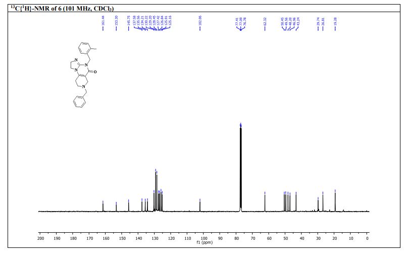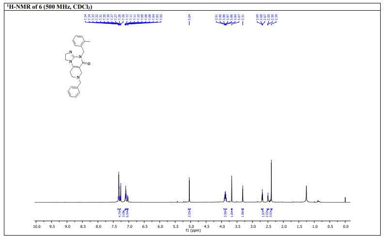 7-Benzyl-4-(2-methylbenzyl)-1,2,6,7,8,9-hexahydroimidazo[1,2-a]pyrido[3,4-e]pyrimidin-5(4H)-one (6): Pale orange semi-solid, 202 mg (0.521 mmol), 52 % Rf = 0.25 (CH3OH/CHCl3 5:95); IR 1490, 1610, 1644, 2882, 2922 cm-1 ; 1H-NMR (500 MHz, CDCl3) δ = 2.39 (s, 3H), 2.54 (t, J = 5.5 Hz, 2H), 2.72 (t, J = 5.7 Hz, 2H), 3.31 (s, 2H), 3.67 (s, 2H), 3.84-3.91 (m, 4H), 5.04 (s, 2H), 7.02-7.04 (m, 1H), 7.08-7.12 (m, 3H), 7.26- 7.34 (m, 5H). 13C{1H}-NMR (101 MHz, CDCl3) δ = 19.3, 26.8, 43.4, 46.9, 48.2, 49.6, 50.45, 62.3, 102.1, 125.2, 125.9, 126.8, 127.4, 128.45, 129.2, 130.2, 134.2, 135.6, 137.9, 145.7, 153.3, 161.4; MS (ESI, m/z): [M+H]+ 387; HRMS (ESI, m/z): calcd for C24H27N4O [M+H]+ found 387.2183.