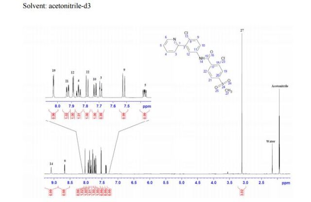 Experimental: 1H NMR (400MHz, CDCl3) δ (ppm): 9.58 (bs, 1H), 8.43 (d, J = 4.7Hz, 1H), 8.03 (dd, J = 2.6, 8.7Hz, 1H), 7.90 (d, J = 1.6Hz, 1H), 7.67-7.78 (m, 4H), 7.60 (d, J = 8.0Hz, 1H), 7. 51 (d, J = 8.8Hz, 1H), 7.23-7.24 (m, 1H), 3.01 (s, 3H).