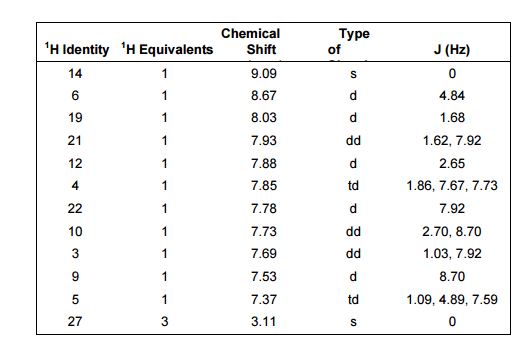 1HNMR (500Hz, DMS0_d6): 10.90 (s, 1H), 8.70 (d, 1H), 8.12 (d, 1H), 8.01 (t, 2H), 7.92 (m, 2H), 7.74 (q, 1H ), 7.69 (d, 1H), 7.58 (d, 1H), 7.44 (m, 1H), 3.34 (s, 3H).
