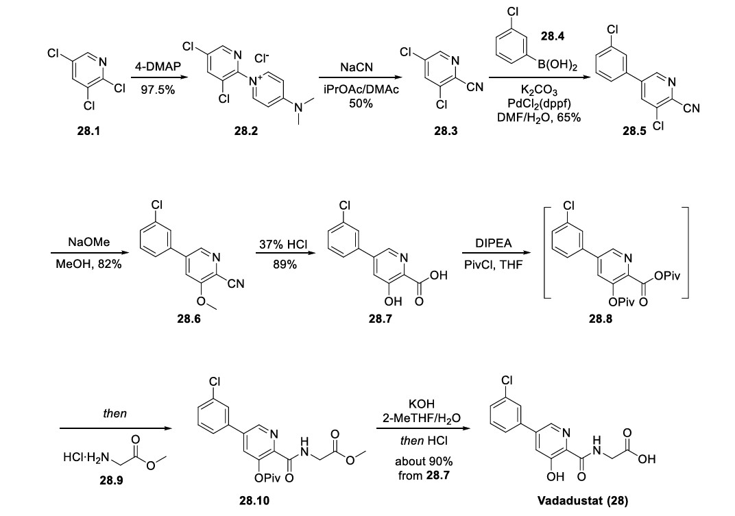 Vadadustat (Vafseo). Vadadustat (28) is a hypoxia inducible factor prolyl hydroxylase (HIF-PH) inhibitor developed by Akebia Therapeutics. It was approved by the European Commission in April 2023, and recently also by the USFDA, for the treatment of symptomatic anemia associated with chronic kidney disease in adults receiving chronic maintenance dialysis. Vadadustat acts by inhibiting HIFPH, 214 which results in increases of endogenous erythropoietin production, red blood cell synthesis, and iron mobilization. 215 While a number of syntheses of vadadustat (28) have been published in previous patents 216−228 and a journal article, 229 Akebia Therapeutics has published two patents regarding the large-scale preparation of vadadustat (Scheme 52). 218,226 The key intermediate nitrile 28.3 could be accessed in two steps: the neat SNAr reaction between commercially available 2,3,5trichloropyridine (28.1) and 4-DMAP to generate pyridinium salt 28.2, followed by a second SNAr reaction of 28.2 with NaCN. The Suzuki coupling between 28.3 and 3-chlorophenyl boronic acid (28.4) gave the biaryl 28.5, and the subsequent SNAr reaction of 28.5 with NaOMe replaced the 3-chloro substitution on the pyridine ring with a methoxy group, generating intermediate 28.6. Global acidic hydrolysis of both methyl ether and nitrile group in 28.6 gave the 3 hydroxypicolinic acid 28.7. Treatment of 28.7 with DIPEA and excess pivaloyl chloride (PivCl) resulted in the formation of mixed anhydride 28.8 with concomitant acylation of the 3 hydroxy group. Without isolation of 28.8, glycine methyl ester hydrochloride (28.9) was then charged with additional DIPEA to generate the corresponding amide 28.10. The residual amount (∼0.5%) of 28.7 in 28.10 was hard to remove, but this impurity could be effectively rejected with an extra amount of DIPEA during workup and solvent switch. Finally, the Opivaloyl group and methyl ester were both removed via basic hydrolysis, giving vadadustat (28) in about 90% yield from 28.7.