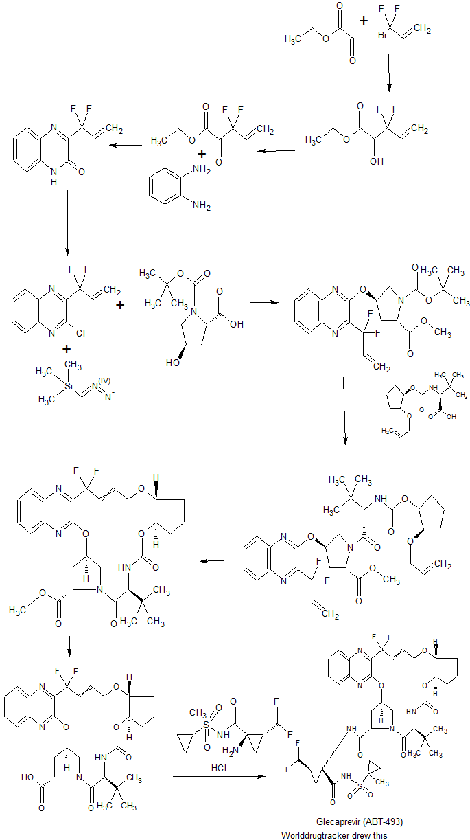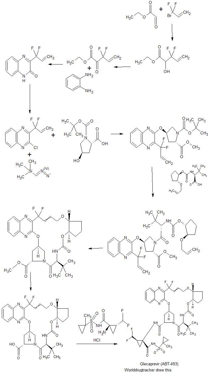 Glecaprevir (INN,[1] codenamed ABT-493) is a hepatitis C virus (HCV) nonstructural (NS) protein 3/4A protease inhibitor that was identified jointly by AbbVie and Enanta Pharmaceuticals. It is being developed as a treatment of chronic hepatitis C infection in co-formulation with an HCV NS5A inhibitor pibrentasvir. Together they demonstrated potent antiviral activity against major HCV genotypes and high barriers to resistance in vitro.[2]