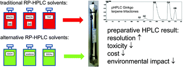 To make preparative Reversed-Phase High Performance Liquid Chromatography (RP-pHPLC) greener, alternative solvents were considered among others in terms of toxicity, cost, safety, workability, chromatographic selectivity and elution strength. The less toxic solvents ethanol, acetone and ethyl acetate were proposed as possible greener replacements for methanol, acetonitrile and tetrahydrofuran (THF).