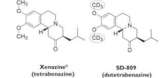 3) substituents have been replaced by deuterium atoms . Deutetrabenazine was found to be more effective for the treatment of chorea associated with Huntington’s disease because of improved pharmacokinetic properties compared with the nondeuterated drug tetrabenazine. Deutetrabenazine was originally developed by Auspex Pharmaceuticals (La Jolla, CA, USA). In 2015, Teva acquired Auspex Pharmaceuticals and submitted a new drug application (NDA) in the United States for the treatment of Huntington’s disease. On April 3, 2017, Teva Pharmaceutical received approval from the FDA to market deutetrabenazine as the first deuterated drug for the treatment of chorea associated with Huntington’s disease.