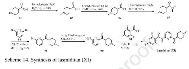 with acyl chloride 91 to give lasmiditan (XI) in 91% yield