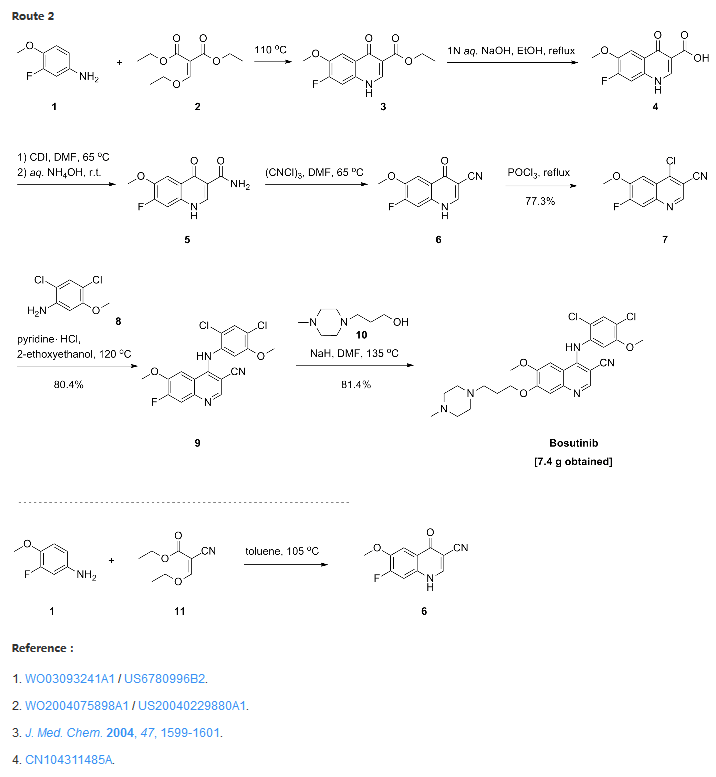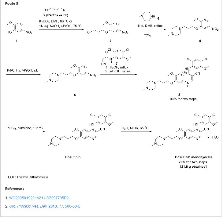 Jun 11, 2010 – Abstract: This paper reports a novel synthesis of bosutinib starting from … C-NMR, MS and the purities of all the compounds were determined …