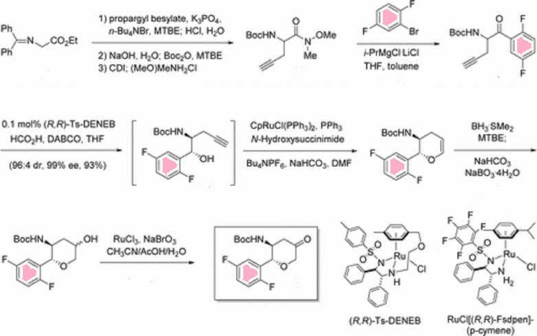 Xu, Feng et al, Process for preparation of chiral trans-2,3-disubstituted 5-oxotetrahydropyrans from ethyl N-(diphenylmethylene)glycinate and propargyl besylate, U.S. Pat. Appl. Publ., US20090187028