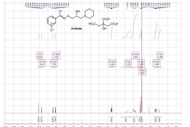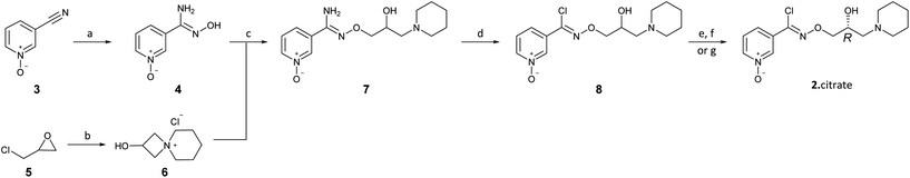 (R)-(+)- Arimoclomol citrate – 2·citrate (R,Z)-3-(N’-(2-hydroxy-3-(piperidin-1-yl)propoxy)carboximidoyl chloride)pyridine-1-oxide (159 mg, 0.51 mmol) was dissolved in acetone (3 mL) and citric acid (97 mg, 0.51 mmol) was added. The reaction mixture was left to stir at room temperature for 18 hours. After this time the mixture was sonicated and the precipitate was filtered, rinsed with cold acetone (1 mL) and dried under vacuum to afford the title compound (165 mg, 64% yield) as a white amorphous solid. Analytical data was consistent with literature values. m.p. 161-162 °C, Acetone (lit. 163-165 °C, EtOH); [α]D 20 +8.0 (c=1, H2O); IR νmax (neat): 3423, 3228, 2949, 2868, 1722, 1589, 1483, 1433, 1307, 1128, 972, 829 cm-1; 1H NMR (600 MHz, d6-DMSO) δ: 8.54 (t, J = 1.5 Hz, 1H), 8.39 – 8.35 (m, 1H), 7.72 – 7.68 (m, 1H), 7.55 (dd, J = 8.0, 6.5 Hz, 1H), 4.28 (ddd, J = 17.6, 13.3, 7.4 Hz, 3H), 3.35 (br. s, 2H), 3.13 – 2.74 (m, 6H), 2.59 (d, J = 15.2 Hz, 2H), 2.56 – 2.51 (m, 2H), 1.77 – 1.61 (m, 4H), 1.48 (s, 2H); 13C NMR (151 MHz, d6-DMSO) δ: 176.6, 171.3, 140.5, 136.4, 132.7, 131.5, 126.8, 123.3, 77.8, 71.4, 63.8, 58.7, 53.1, 44.0, 30.7, 23.0, 21.9; HRMS (m/z TOF MS ES+) for C14H20ClN3O3 [M+H]+ calc. 314.1271, observed 314.1263; SFC er purity R:S >99:1