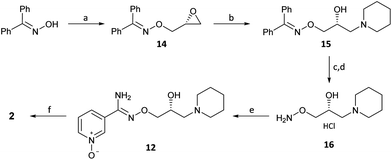 (R,Z)-3-(N’-(2-hydroxy-3-(piperidin-1-yl)propoxy)carboximidoyl chloride)pyridine-1-oxide1 – (R)-(+)-Arimoclomol – 2 A solution of (R,Z)-3-(N’-(2-hydroxy-3-(piperidin-1-yl)propoxy)carbamimidoyl)pyridine-1-oxide 12 (205 mg, 0.70 mmol) in conc. hydrochloric acid (1.1 mL, 13.9 mmol) and water (3 mL) was cooled to -5 °C for 15 minutes. Sodium nitrite (63 mg, 0.91 mmol) in water (0.5 mL) was then added dropwise to the reaction mixture and the reaction was stirred at -5 °C for 2.5 hours. The reaction mixture was made alkaline with NaOH (7 M, 3 mL). An additional 10 mL of water was added followed by DCM (30 mL) containing EtOAc (5 mL) and the organics were dried over MgSO4, filtered and concentrated in vacuo. The residue was purified by FCC on Biotage Isolera using Biotage SNAP 10 g Si cartridge eluting with gradient elution 0-30% MeOH:DCM both containing 0.1% Et3N to afford the title compound (160 mg, 73% yield) as a colourless semi-solid. Analytical data was consistent with literature values. See ESI section SFC traces for specific enantiomeric ratios of 2 synthesised under the various methodologies quoted in the text. Optical rotation was not determined as it was determined in the ultimate product of this 2·citrate and comparative run times on SFC. 1H NMR (600 MHz, CDCl3) δ: 8.63 (t, J = 1.4 Hz, 1H), 8.16 (ddd, J = 6.4, 1.6, 0.9 Hz, 1H), 7.66 – 7.62 (m, 1H), 7.25 (dd, J = 8.0, 6.6 Hz, 1H), 4.26 (qd, J = 11.3, 5.2 Hz, 2H), 4.07 (dd, J = 9.2, 4.7 Hz, 1H), 2.62 (s, 2H), 2.47 – 2.31 (m, 4H), 1.65 – 1.51 (m, 4H), 1.42 (s, 2H); 13C NMR (151 MHz, CDCl3) δ: 140.3, 137.7, 133.1, 132.5, 125.7, 123.9, 78.7, 64.9, 60.9, 54.8, 25.8, 24.0.