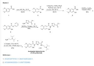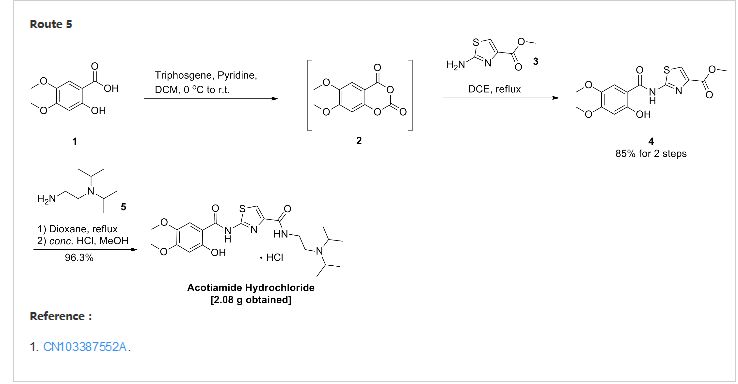 A test for the amine hydrochloride (z-338) Compound Patent Application (CN96194002.6) choosing 2,4,5-trimethoxy benzoic acid as a starting material first with 2-aminothiazol-4-carboxylate reacts 2- [(2-hydroxy-4,5-dimethoxybenzoyl) amino] -1,3-thiazole-4-carboxylate, 2-methyl-benzene and then removed, the yield of this method lower demethylation selectivity bad. So choose the first 2-methyl-removal before subsequent reaction better.