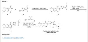In a closely related procedure, acid chloride (II), prepared by treatment of 2,4,5-trimethoxybenzoic acid (VI) with SOCl2 in hot toluene, was condensed with aminothiazole (I), yielding amide (III). Displacement of the ethyl ester group of (III) by N,N-diisopropyl ethanediamine (V) furnished diamide (VII). Finally, upon formation of the hydrochloride salt of (VII) in isopropanol, the 2-methoxy group was simultaneously cleaved, directly leading to the title compound.